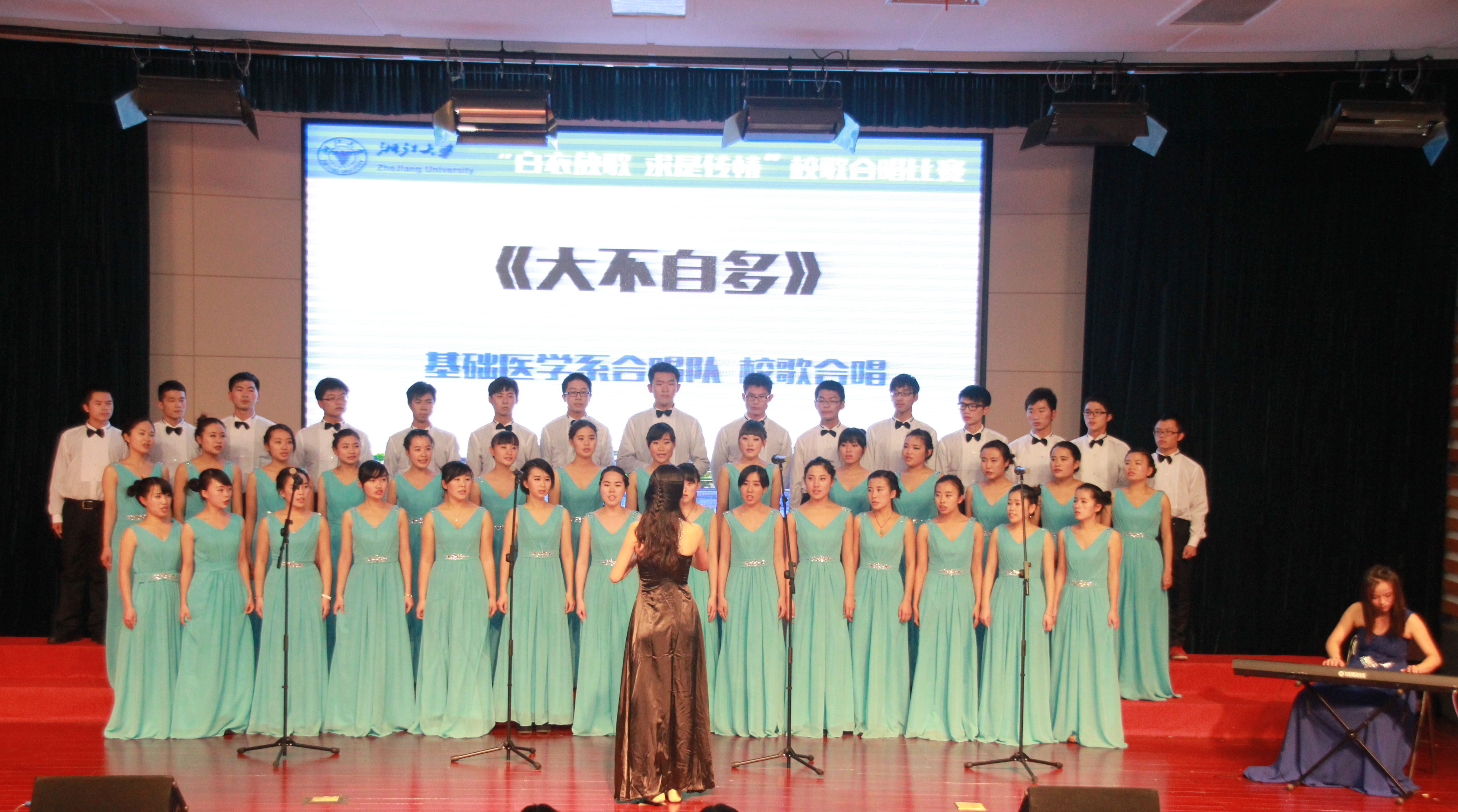 公共卫生系队是第一个出场的队伍,当他们唱出校歌第一句“大不自多,海纳江河”的时候, 立即吸引了全场所有人的目光,从他们歌声里所透露出奋发向上的精神触动了在场所有的人,而委婉动听的自选曲目《青春舞曲》加上美丽的舞蹈,更是让人惊叹;第二个出场的队伍是浙医一院队,雄壮的校歌后是活泼向上的《阳光路上》,让大家坚信医学之路这充满阳光;妇儿口腔医院联队不仅将校歌演绎的动人心弦,一首《爱因为在心中》更是唱出了医者的大爱;浙医二院队第四个出场,高亢嘹亮的校歌搭配温婉绵长的《光阴的故事》,让大家在回忆往昔中思绪翩翩,多样的队形变换也让人惊喜连连;邵逸夫医院队为大家演绎了校歌与《仰望星空》,挥舞的星星,纸飞机优美的弧线,给大家留下了深刻的印象;基础医学系作为去年的冠军,通过开场一段耳目一新的影子戏,给大家讲述了基础医学系的过去、现在,更憧憬了美好的未来,随后的校歌和《歌唱祖国》,不禁让人感叹,基础医学系果然不同凡响;最后压轴的是我们医学院的新成员——转化医学研究院队,虽然是第一次参加比赛,但是选手们毫不怯场,一首《明天会更好》,振奋人心的口号和团结协作的气势让我们坚信,转化医学研究院的明天一定会更好!