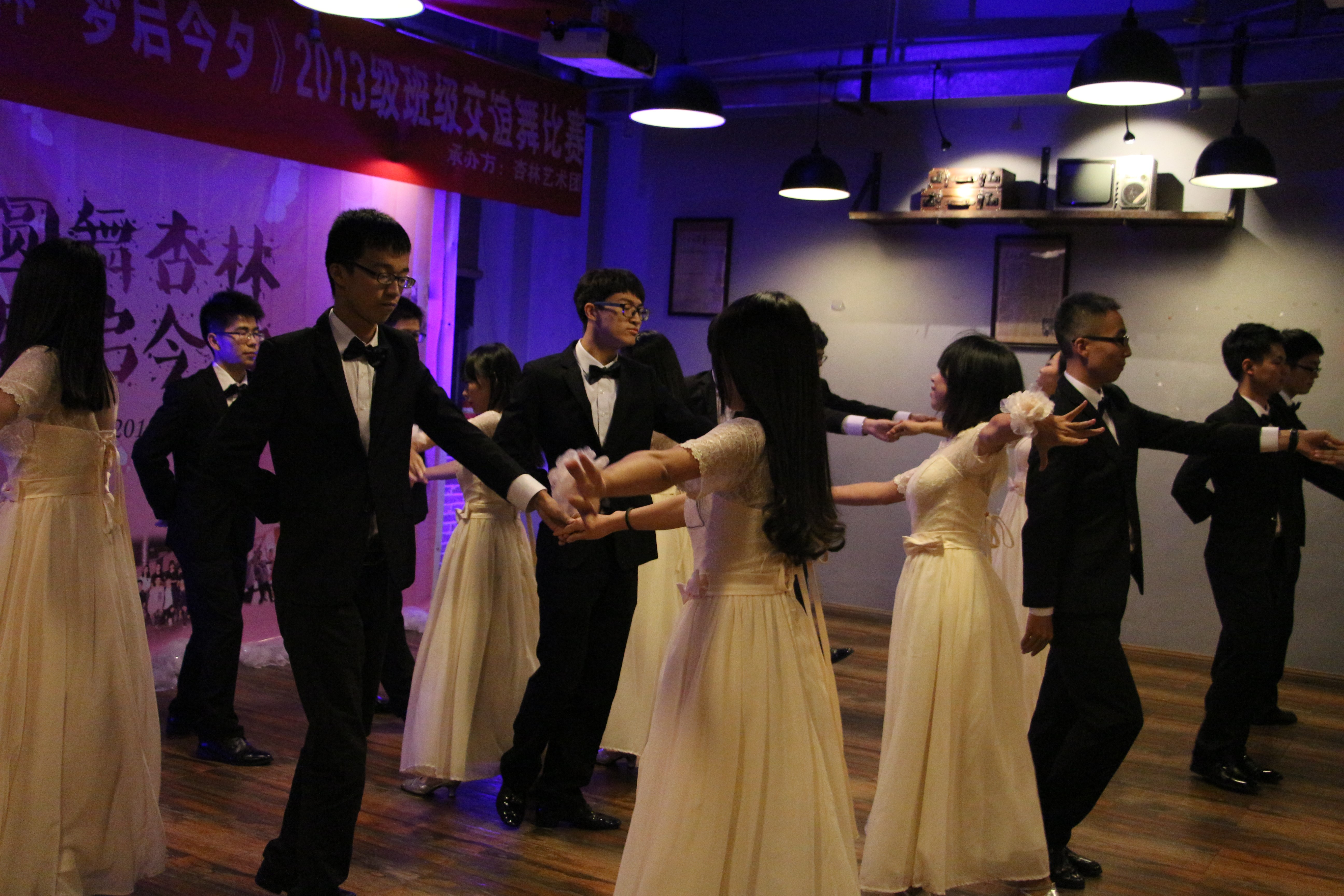 绚丽的灯光犹如天女撒下的朵朵花瓣,优雅地流洒飘零,落在13级学生们神采奕奕、容光焕发的脸庞上。舞会中他们盛装出席、笑容满面,迈着自信的步子,紧携舞伴之手,眼波流转之间舞步变幻:时而轻云般慢移,时而旋风般旋转,舞蹈出诗句里的悲欢离合。华灯初上,似梦似幻,轻缓的音乐中上演着王子与公主的邂逅,让观众们深深沉醉。